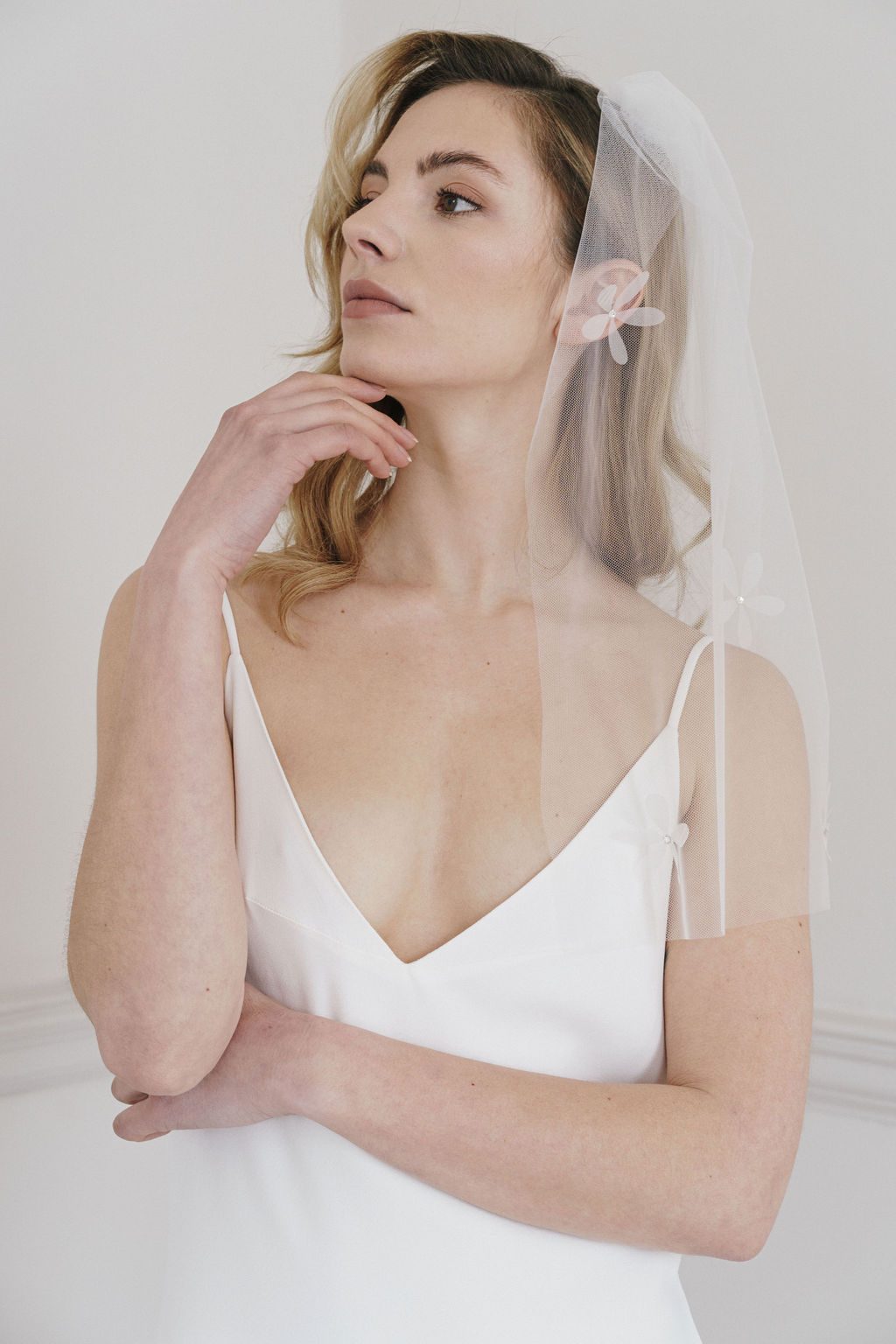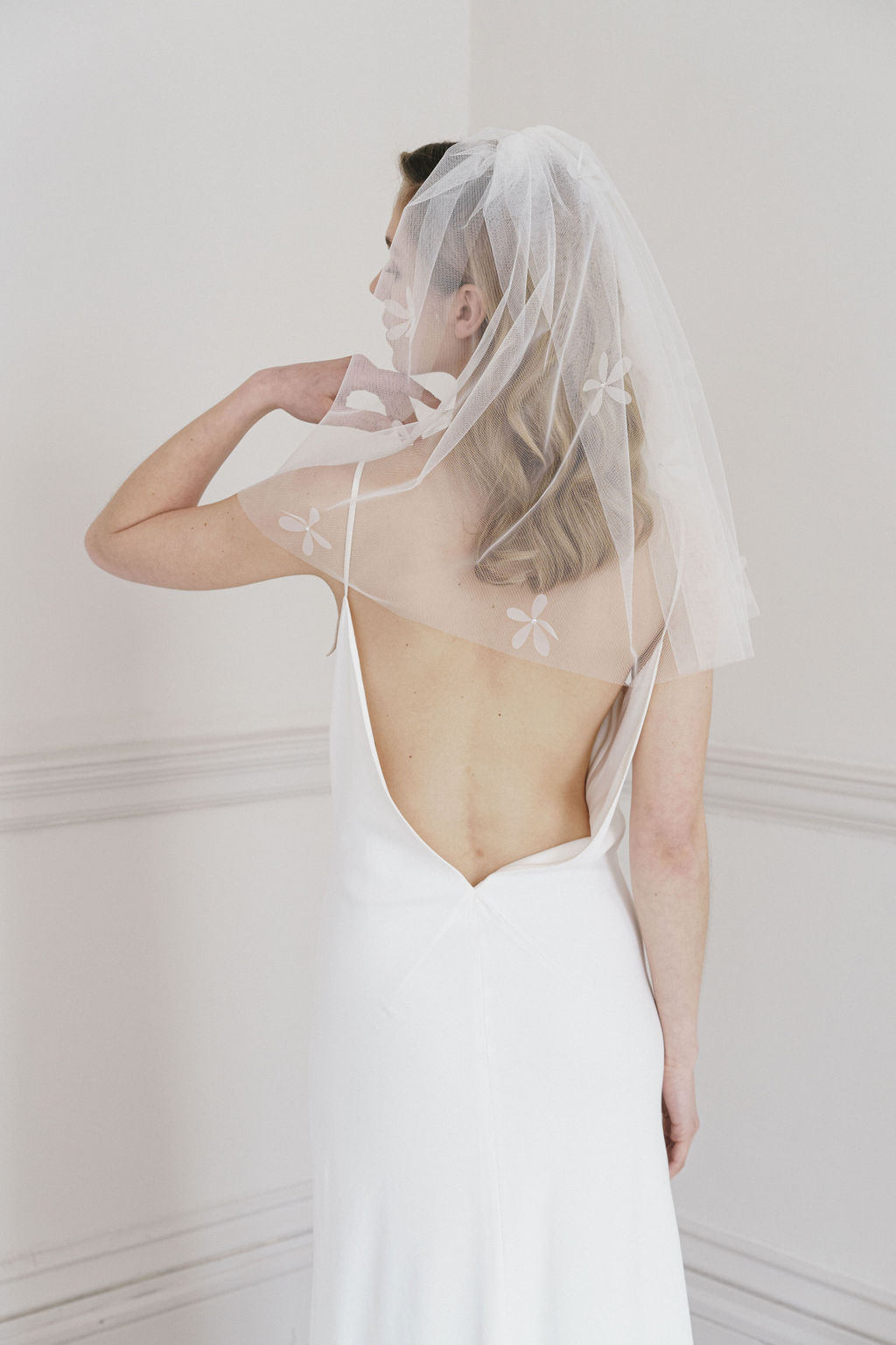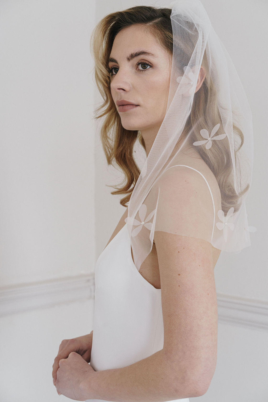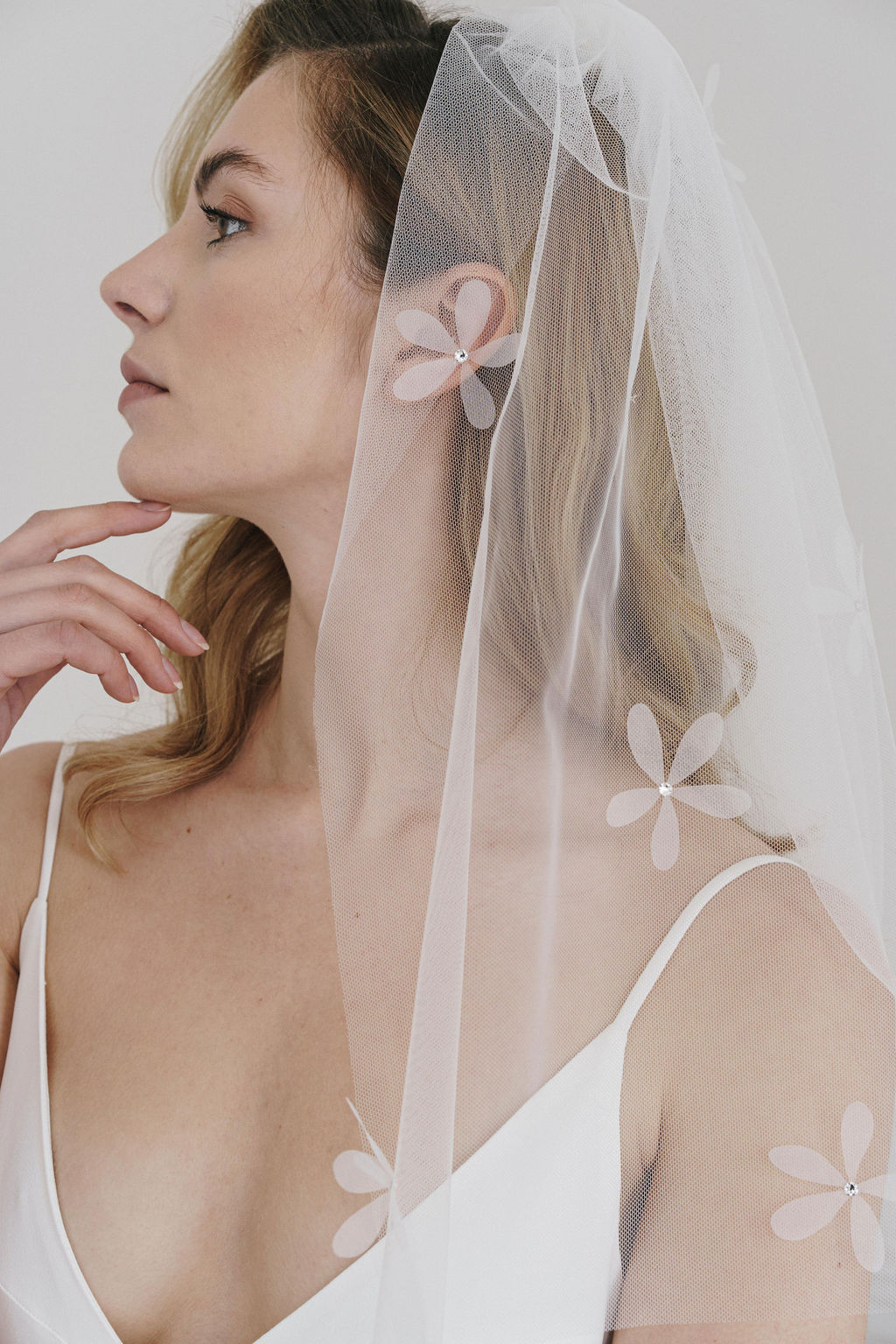 A super short, blusher variation on the full length 'Petal' veil (which is also available to buy online). Organza daisy appliques scatter the soft tulle veil, with Swarovski Crystals in the centres.